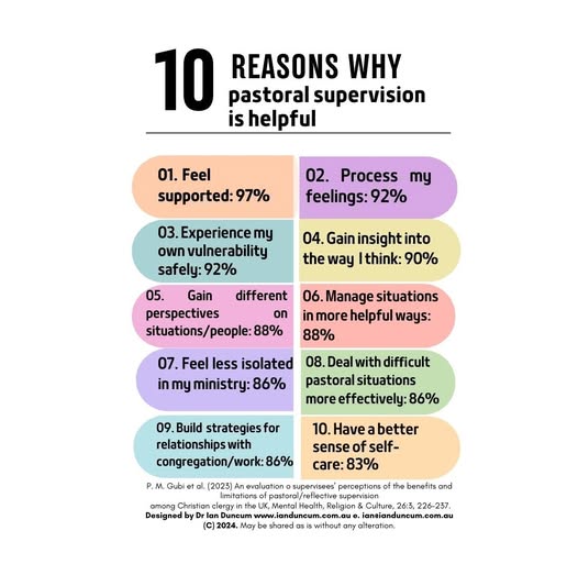 In recent decades, people in ministry and community work have been engaging with professional supervision designed to address their unique pastoral needs, for the  benefit of those they serve. Denominations and Christian organisations are increasingly seeing the value of keeping their staff and clergy in good shape through supervision. In many cases it is mandatory. It may be paid for by the employer or organisation, or by the supervisee themselves.